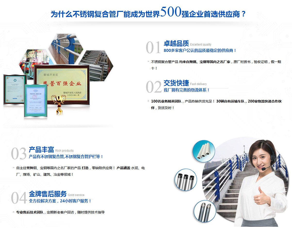 公司全體員工自2003年從事工程制作、施工以來,積累了許多施工技術和經驗,能在短期內,高質、高效的完成各種工程,公司現引進國際先進項目管理體制和市場研發應用能力,從事專業不銹鋼/碳素鋼復合管大型道橋欄桿設計、生產、制作、安裝。 不銹鋼復合管是由不銹鋼管與碳素鋼管復合而成的,技術含量高,設備精密,工藝先進產品質量穩定,采用電腦自動控制。產品具有純不銹鋼外表豪華、美觀和普通碳素鋼管強度高的特點,其價格低于純不銹鋼管,是價昂不銹鋼結構裝飾管材的替代產品。產品廣泛用于市政公用工程施工,鋼結構、網架工程施工,石油石化、市政設施、路橋護欄、公路交通工程施工;建筑裝飾工程施工;體育場地設施工程施工交通格柵、鐵路隔離網、建筑裝飾、路燈、站牌、鋼結構網架、家具、車船制造、城市管網、輸油輸氣、摩托車保險杠、晾衣架、自行車車把等;產品規格φ9.5mm—φ219mm,壁厚0.5mm—18.0mm,表面光亮…